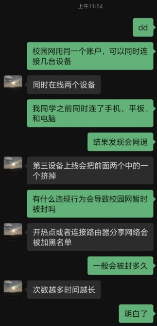 应国家网络安全法规定,使用校园网等公共网络时为了做安全追踪,禁止开热点,禁止使用路由器、模拟机、虚拟器、VPN、万能钥匙、360WiFi、猎豹 WiFi、手游助手、游戏加速器、信号桥等软件;手机上双 WiFi 加速和 WiFi+功能不要开启。黑名单两个小时后自动解除,请自觉遵守相关法律法规,文明上网。